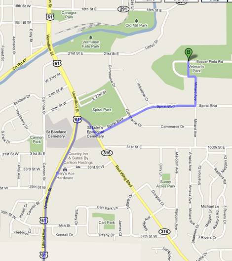 US-61 comes into Hastings, turn right on Red Wing Blvd,